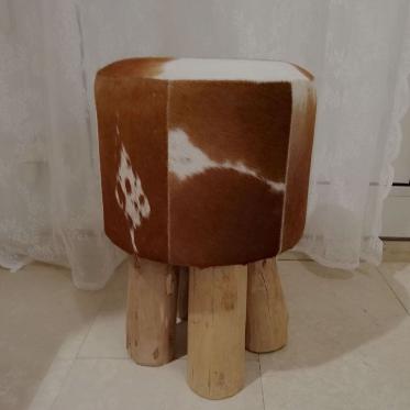 schöne und stabile Holzhocker - jeder ein Einzelstück und mit anderes geflecktem Fell.