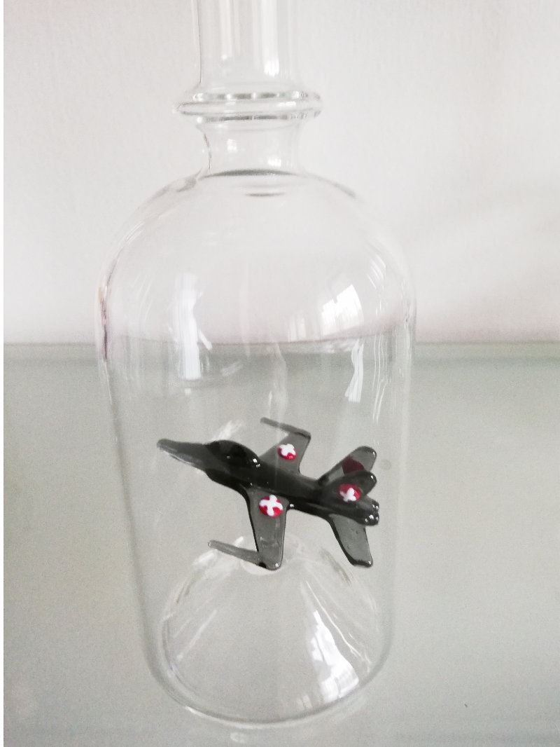 mit Militärflugzeug- Sujet (Glasbläserarbeit) in der Flasche