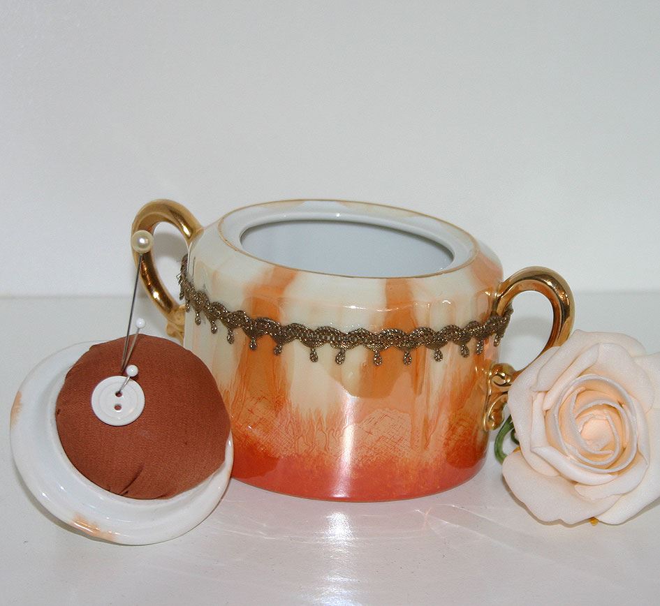 Nadelikissen innen im Deckel, verziert mit Brocatspitzen, viel Platz für Fingerhüte, Knöpfe etc.