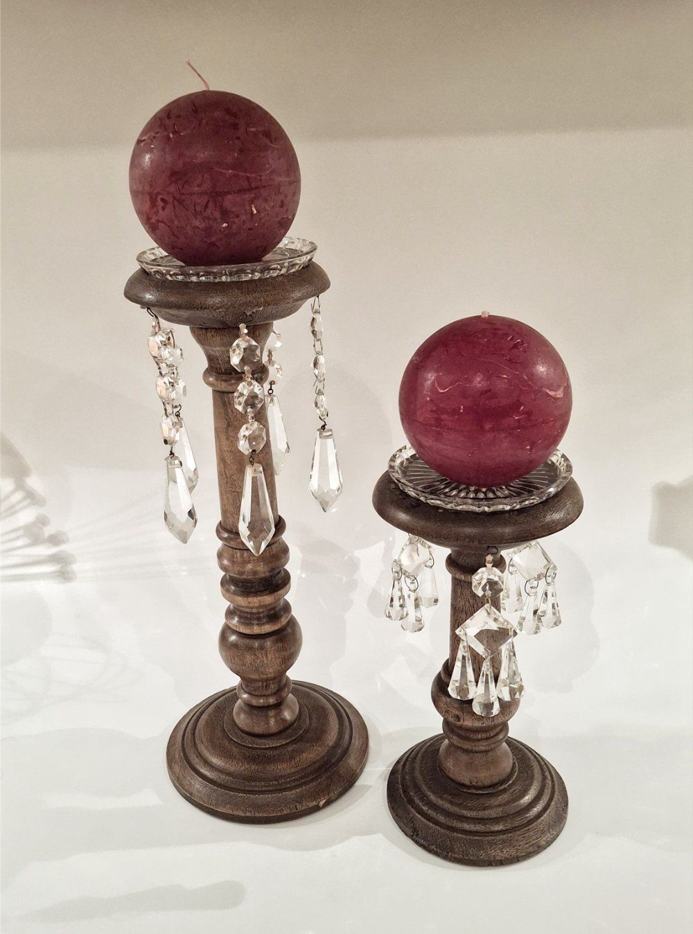 Holzkerzenständer mit antiken Kristallglas-Lüsterteilen