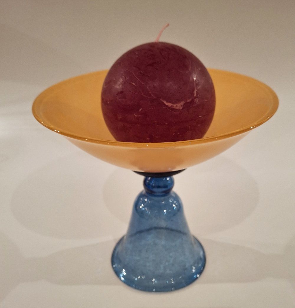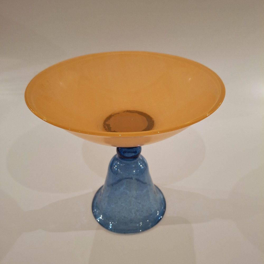 Schale aus altem Glas - Fussbecher und Schale Höhe 15.5 cm, oben Durch. gelb 17 cm, Durchm. Glas unten 9 cm (blau) kann als Schale oder Dekovase benützt werden